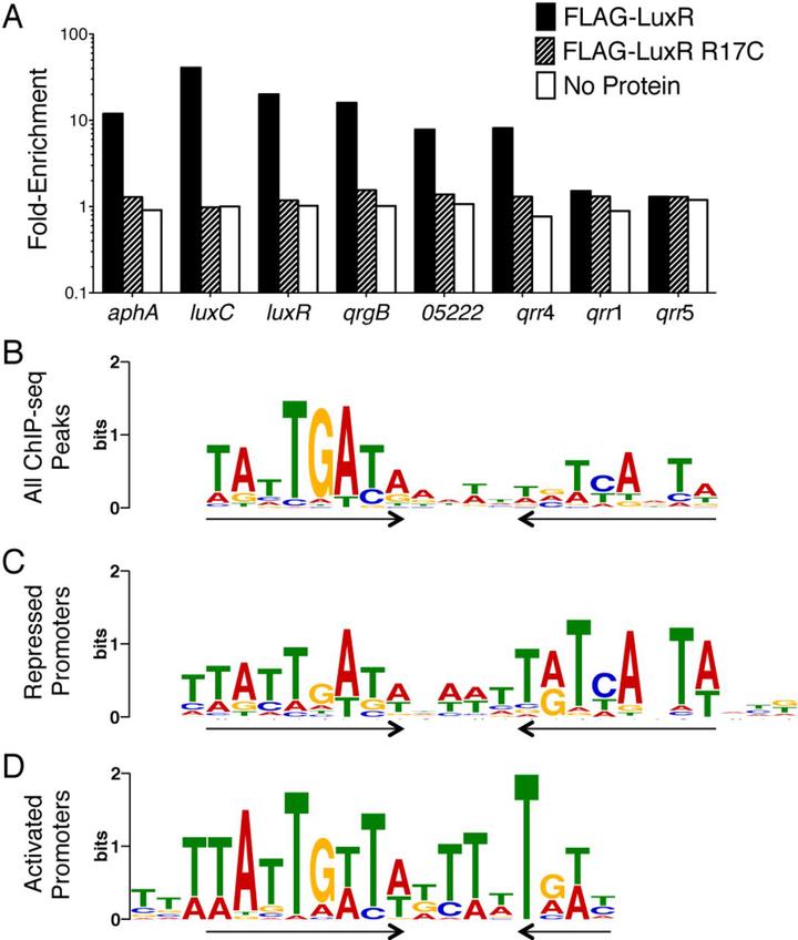 LuxR-type transcription factors are the master regulators of quorum sensing in vibrios. LuxR proteins are unique members of the TetR superfamily of transcription factors because they activate and repress large regulons of genes. Here, we used chromatin immunoprecipitation and nucleotide sequencing (ChIP-seq) to identify LuxR binding sites in the Vibrio harveyi genome. Bioinformatics analyses showed that the LuxR consensus binding site at repressed promoters is a symmetric palindrome, whereas at activated promoters it is asymmetric and contains only half of the palindrome. Using a genetic screen, we isolated LuxR mutants that separated activation and repression functions at representative promoters. These LuxR mutants exhibit sequence-specific DNA binding defects that restrict activation or repression activity to subsets of target promoters. Altering the LuxR DNA binding site sequence to one more closely resembling the ideal LuxR consensus motif can restore in vivo function to a LuxR mutant. This study provides a mechanistic understanding of how a single protein can recognize a variety of binding sites to differentially regulate gene expression.