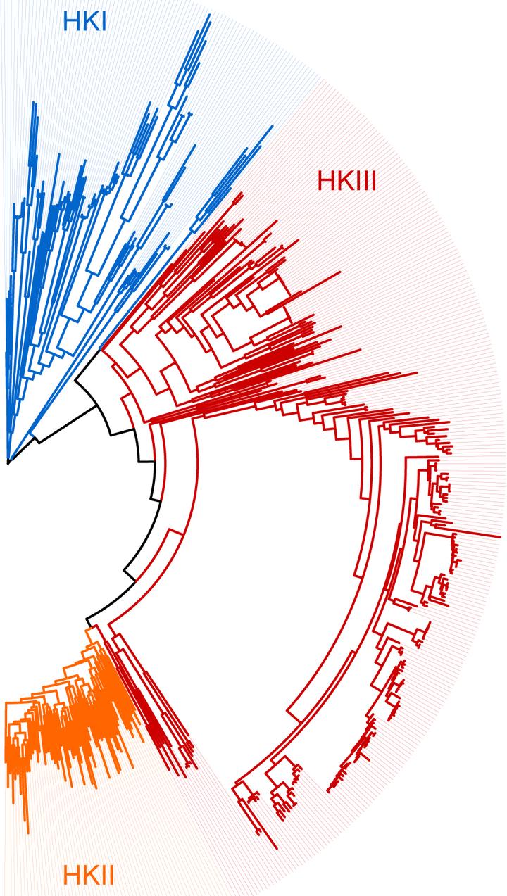 Histidine kinases are key components of regulatory systems that enable bacteria to respond to environmental changes. Two major classes of histidine kinases are recognized on the basis of their modular design: classical (HKI) and chemotaxis specific (HKII). Recently, a new type of histidine kinase that appeared to have features of both HKIs and HKIIs was identified and termed HKIII; however, the details of HKIII’s relationship to other two classes of histidine kinases, their function, and evolutionary history remain unknown. Here, we carried out genomic, phylogenetic, and protein sequence analyses that allowed us to reveal the unusual evolutionary history of this protein family, formalize its distinctive features, and propose its putative function. HKIIIs are characterized by the presence of sensory domains and the lack of a dimerization domain, which is typically present in all histidine kinases. In addition to a single-domain response regulator, HKIII signal transduction systems utilize CheX phosphatase and, in many instances, an unorthodox soluble chemoreceptor that are usual components of chemotaxis signal transduction systems. However, many HKIII genes are found in genomes completely lacking chemotaxis genes, thus decoupling their function from chemotaxis. By contrast, all HKIII-containing genomes also contain pilT, a marker gene for bacterial type IV pilus-based motility, whose regulation is proposed as a putative function for HKIII. These signal transduction systems have a narrow phyletic distribution but are present in many emerging and opportunistic pathogens, thus offering an attractive potential target for future antimicrobial drug design.