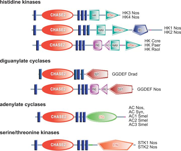 Transmembrane receptors in microorganisms, such as sensory histidine kinases and methyl-accepting chemotaxis proteins, are molecular devices for monitoring environmental changes. We report here that sensory domain sharing is widespread among different classes of transmembrane receptors. We have identified two novel conserved extracellular sensory domains, named CHASE2 and CHASE3, that are found in at least four classes of transmembrane receptors: histidine kinases, adenylate cyclases, predicted diguanylate cyclases, and either serine/threonine protein kinases (CHASE2) or methyl-accepting chemotaxis proteins (CHASE3). Three other extracellular sensory domains were shared by at least two different classes of transmembrane receptors: histidine kinases and either diguanylate cyclases, adenylate cyclases, or phosphodiesterases. These observations suggest that microorganisms use similar conserved domains to sense similar environmental signals and transmit this information via different signal transduction pathways to different regulatory circuits: transcriptional regulation (histidine kinases), chemotaxis (methyl-accepting proteins), catabolite repression (adenylate cyclases), and modulation of enzyme activity (diguanylate cyclases and phosphodiesterases). The variety of signaling pathways using the CHASE-type domains indicates that these domains sense some critically important extracellular signals.