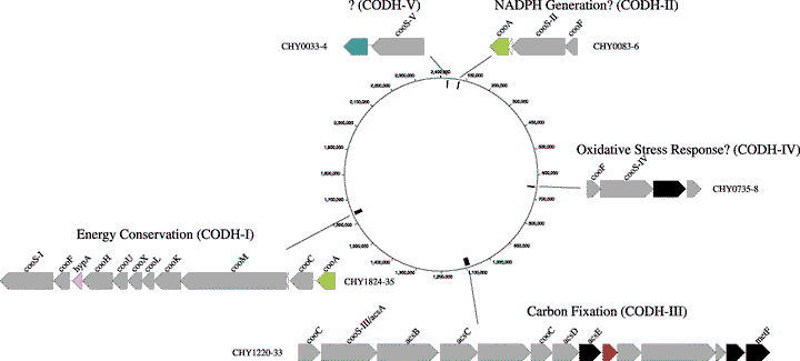 We report here the sequencing and analysis of the genome of the thermophilic bacterium Carboxydothermus hydrogenoformans Z-2901. This species is a model for studies of hydrogenogens, which are diverse bacteria and archaea that grow anaerobically utilizing carbon monoxide (CO) as their sole carbon source and water as an electron acceptor, producing carbon dioxide and hydrogen as waste products. Organisms that make use of CO do so through carbon monoxide dehydrogenase complexes. Remarkably, analysis of the genome of C. hydrogenoformans reveals the presence of at least five highly differentiated anaerobic carbon monoxide dehydrogenase complexes, which may in part explain how this species is able to grow so much more rapidly on CO than many other species. Analysis of the genome also has provided many general insights into the metabolism of this organism which should make it easier to use it as a source of biologically produced hydrogen gas. One surprising finding is the presence of many genes previously found only in sporulating species in the Firmicutes Phylum. Although this species is also a Firmicutes, it was not known to sporulate previously. Here we show that it does sporulate and because it is missing many of the genes involved in sporulation in other species, this organism may serve as a “minimal” model for sporulation studies. In addition, using phylogenetic profile analysis, we have identified many uncharacterized gene families found in all known sporulating Firmicutes, but not in any non-sporulating bacteria, including a sigma factor not known to be involved in sporulation previously.