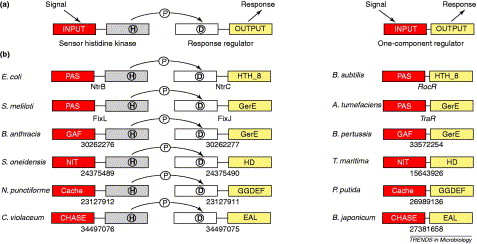Two-component systems that link environmental signals to cellular responses are viewed as the primary mode of signal transduction in prokaryotes. By analyzing information encoded by 145 prokaryotic genomes, we found that the majority of signal transduction systems consist of a single protein that contains input and output domains but lacks phosphotransfer domains typical of two-component systems. One-component systems are evolutionarily older, more widely distributed among bacteria and archaea, and display a greater diversity of domains than two-component systems.