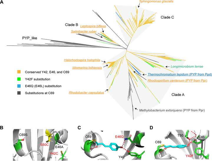 Photoactive yellow protein (PYP) is a model photoreceptor. It binds a p-coumaric acid as a chromophore, thus enabling blue light sensing. The first discovered single-domain PYP from Halorhodospira halophila has been studied thoroughly in terms of its structural dynamics and photochemical properties. However, the evolutionary origins and biological role of PYP homologs are not well understood. Here, we show that PYP is an evolutionarily novel domain family of the ubiquitous PAS (Per-Arnt-Sim) superfamily. It likely originated from the phylum Myxococcota and was then horizontally transferred to representatives of a few other bacterial phyla. We show that PYP is associated with signal transduction either by domain fusion or by genome context. Key cellular functions modulated by PYP-initiated signal transduction pathways likely involve gene expression, motility, and biofilm formation. We identified three clades of the PYP family, one of which is poorly understood and potentially has novel functional properties. The Tyr42, Glu46, and Cys69 residues that are involved in p-coumaric acid binding in the model PYP from H. halophila are well conserved in the PYP family. However, we also identified cases where substitutions in these residues might have led to neofunctionalization, such as the proposed transition from light to redox sensing. Overall, this study provides definition, a newly built hidden Markov model, and the current genomic landscape of the PYP family and sets the stage for the future exploration of its signaling mechanisms and functional diversity.