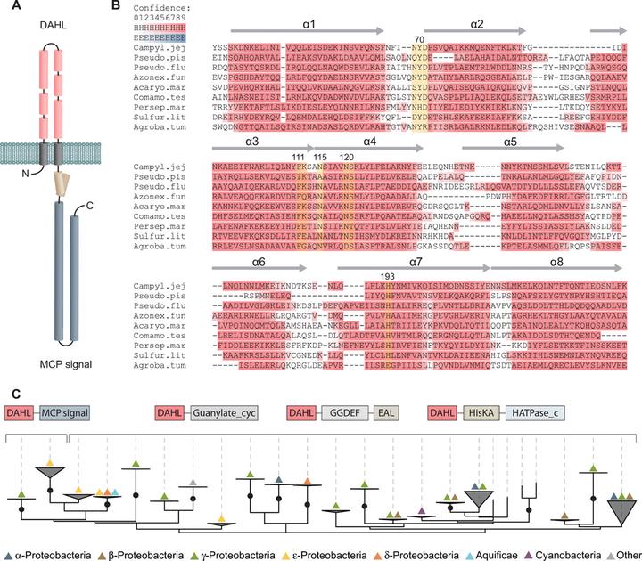 Campylobacter jejuni is a bacterial pathogen that is a common cause of enteritis in humans. We identified a previously uncharacterized type of sensory domain in the periplasmic region of the C. jejuni chemoreceptor Tlp10, termed the DAHL domain, that is predicted to have a bimodular helical architecture. Through two independent ligand-binding sites in this domain, Tlp10 responded to molecular aspartate, isoleucine, fumarate, malate, fucose, and mannose as attractants and to arginine, galactose, and thiamine as repellents. Tlp10 also recognized glycan ligands when present as terminal and intermediate residues of complex structures, such as the fucosylated human ganglioside GM1 and Lewisa antigen. A tlp10 mutant strain lacking the ligand-binding sites was attenuated in its ability to colonize avian caeca and to adhere to cultured human intestinal cells, indicating the potential involvement of the DAHL domain in host colonization and disease. The Tlp10 intracellular signaling domain interacted with the scaffolding proteins CheV and CheW, which couple chemoreceptors to intracellular signaling machinery, and with the signaling domains of other chemoreceptors, suggesting a key role for Tlp10 in signal transduction and incorporation into sensory arrays. We identified the DAHL domain in other bacterial signal transduction proteins, including the essential virulence induction protein VirA from the plant pathogen Agrobacterium tumefaciens. Together, these results suggest a potential link between Tlp10 and C. jejuni virulence.