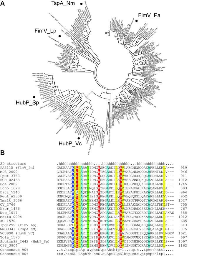 FimV is a Pseudomonas aeruginosa inner membrane protein that regulates intracellular cyclic AMP (cAMP) levels—and thus type IV pilus (T4P)-mediated twitching motility and type II secretion (T2S)—by activating the adenylate cyclase CyaB. Its cytoplasmic domain contains three predicted tetratricopeptide repeat (TPR) motifs separated by an unstructured region: two proximal to the inner membrane and one within the “FimV C-terminal domain,” which is highly conserved across diverse homologs. Here, we present the crystal structure of the FimV C terminus, FimV861–919, containing a TPR motif decorated with solvent-exposed, charged side chains, plus a C-terminal capping helix. FimV689, a truncated form lacking this C-terminal motif, did not restore wild-type levels of twitching or surface piliation compared to the full-length protein. FimV689 failed to restore wild-type levels of the T4P motor ATPase PilU or T2S, suggesting that it was unable to activate cAMP synthesis. Bacterial two-hybrid analysis showed that TPR3 interacts directly with the CyaB activator, FimL. However, FimV689 failed to restore wild-type motility in a fimV mutant expressing a constitutively active CyaB (fimV cyaB-R456L), suggesting that the C-terminal motif is also involved in cAMP-independent functions of FimV. The data show that the highly conserved TPR-containing C-terminal domain of FimV is critical for its cAMP-dependent and -independent functions.